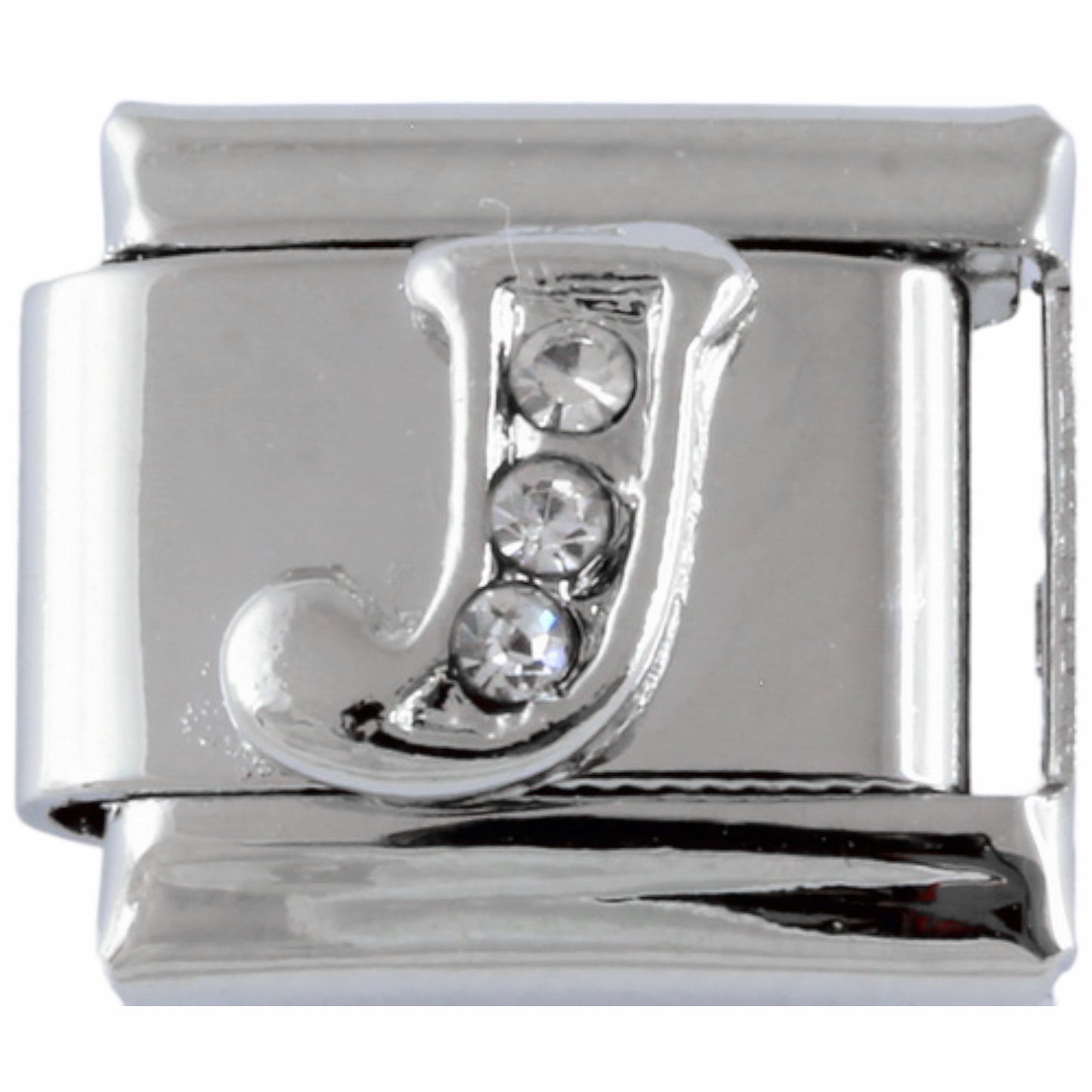 Silver plated Letter J enamel &or metal charm is soldered onto a stainless steel Italian charm. This charm fits any 9mm Italian charm bracelet