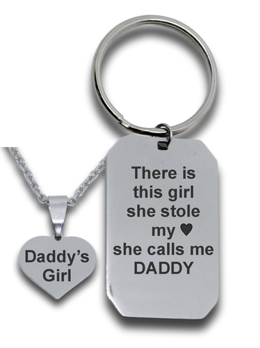 Stainless steel engraved dog tag keyring and heart pendant with stainless steel chain.