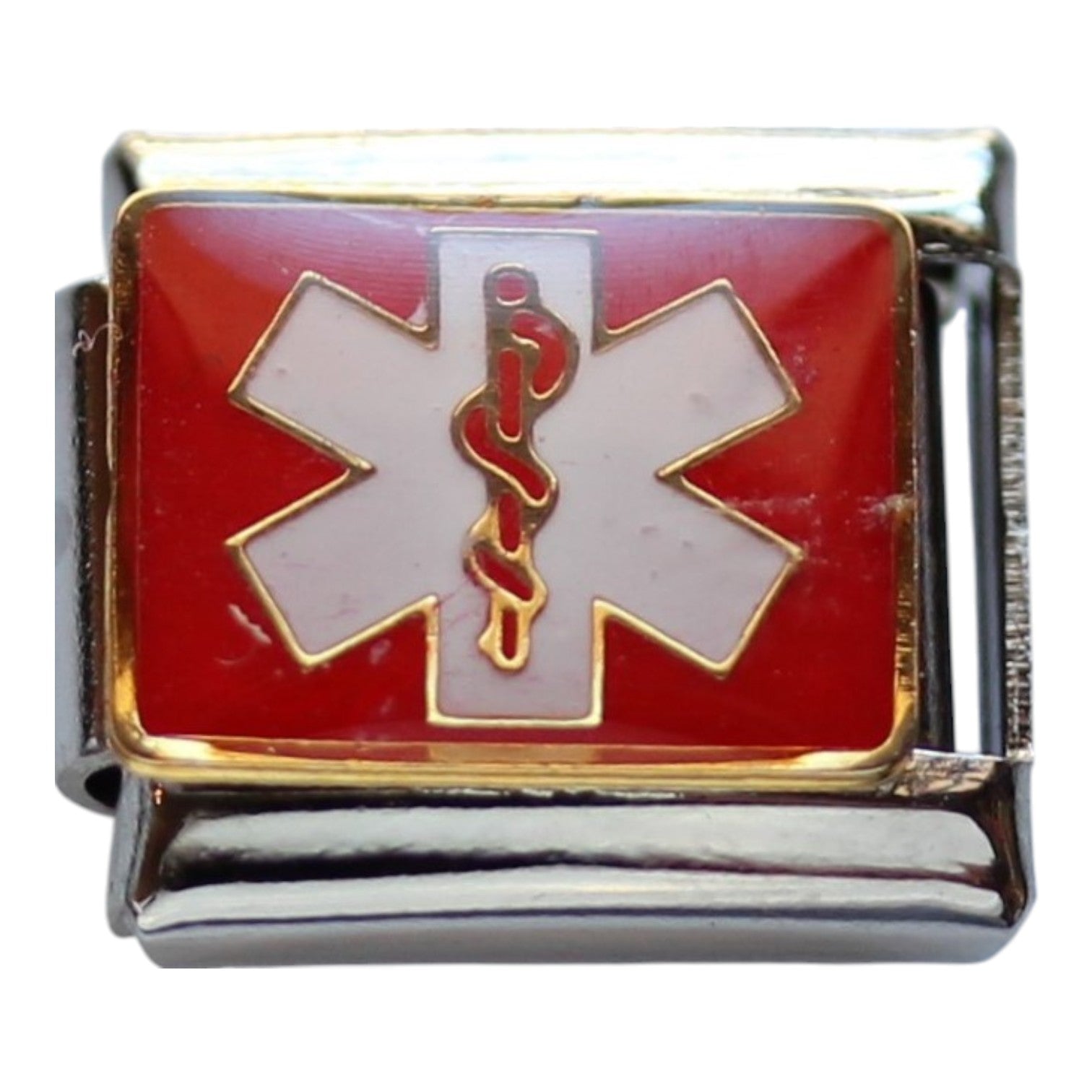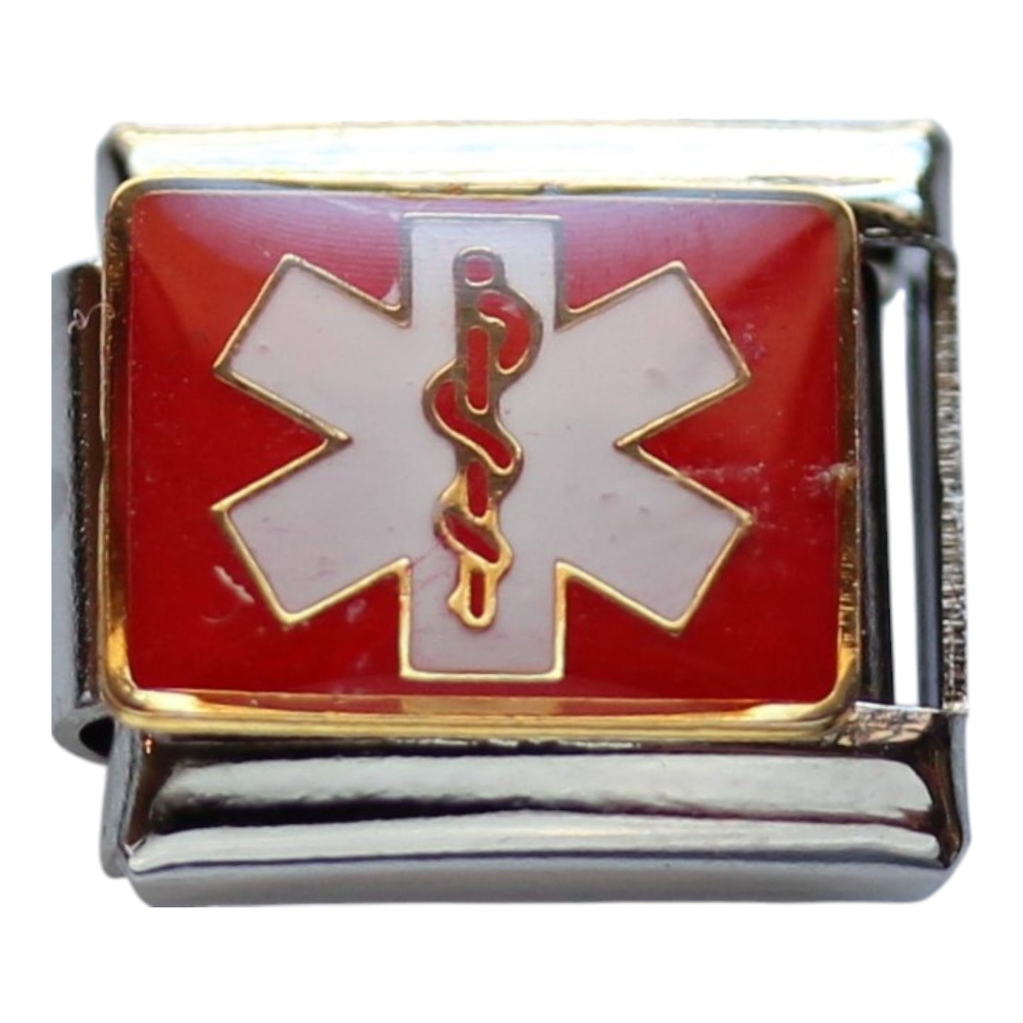 Medical Alert enamel &or metal charm is soldered onto a stainless steel Italian charm. This charm fits any 9mm Italian charm bracelet.