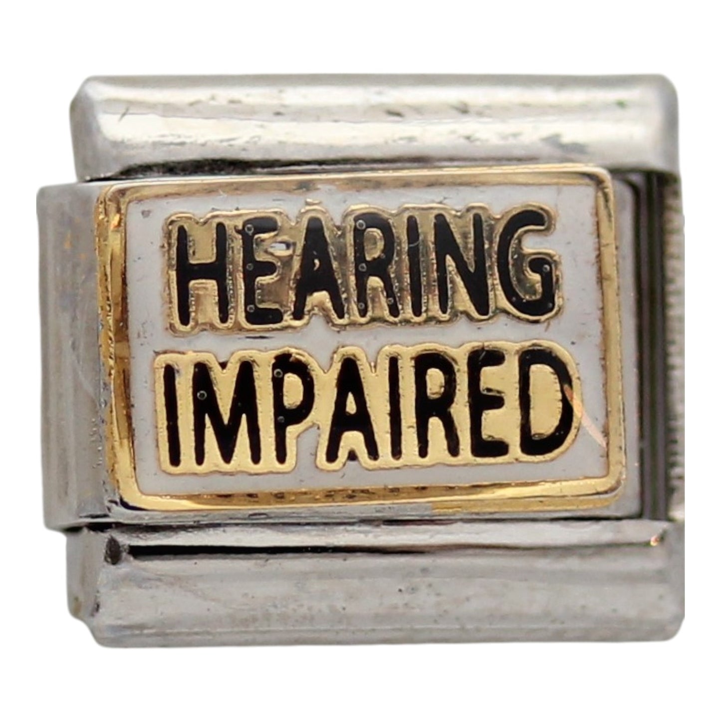 Medic Alert - Hearing Impaired enamel &or metal charm is soldered onto a stainless steel Italian charm. This charm fits any 9mm Italian charm bracelet.