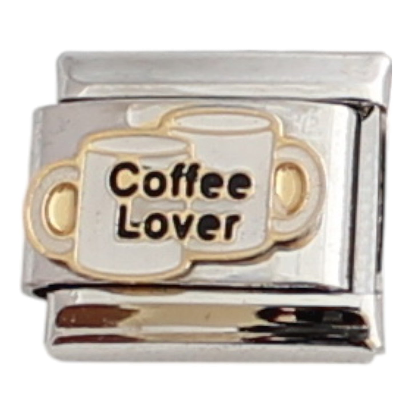 Coffee Lover enamel &or metal charm is soldered onto a stainless steel Italian charm. This charm fits any 9mm Italian charm bracelet