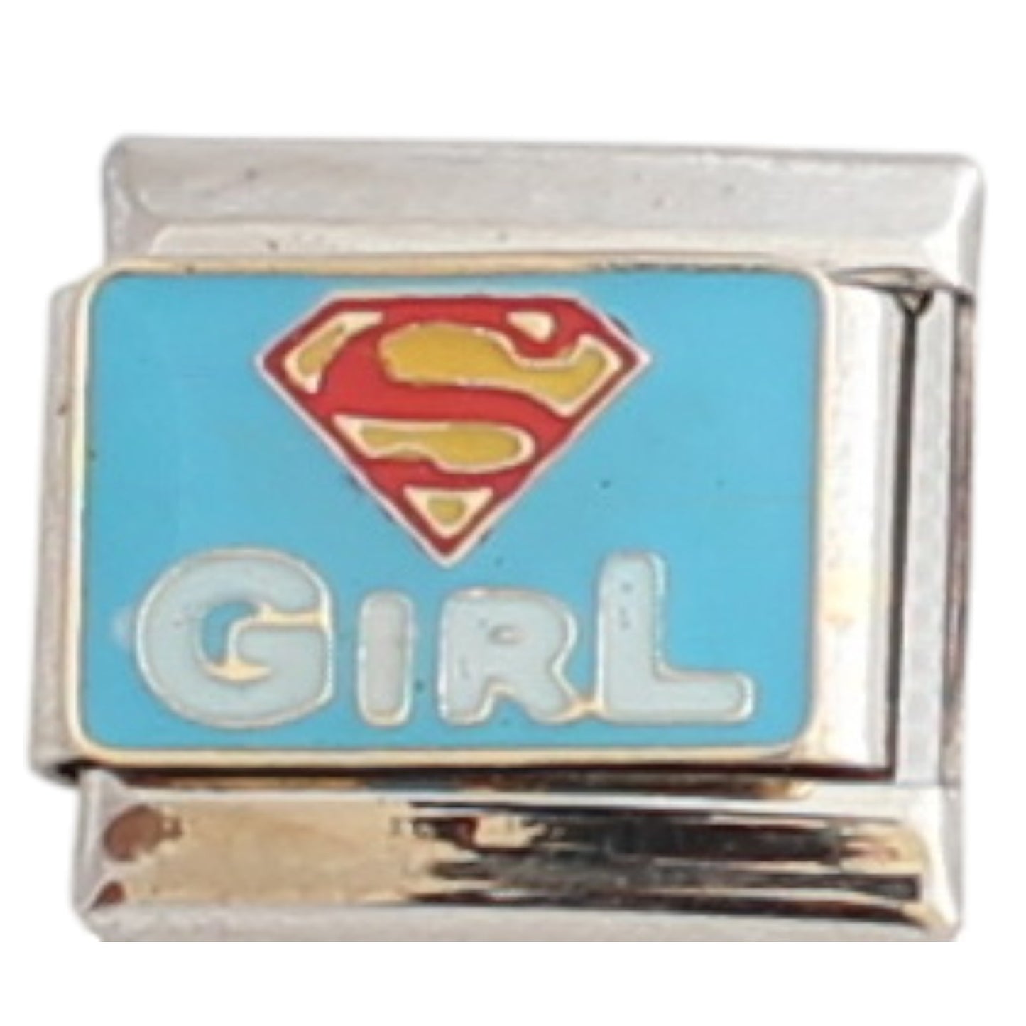 Super Girl enamel &or metal charm is soldered onto a stainless steel Italian charm. This charm fits any 9mm Italian charm bracelet