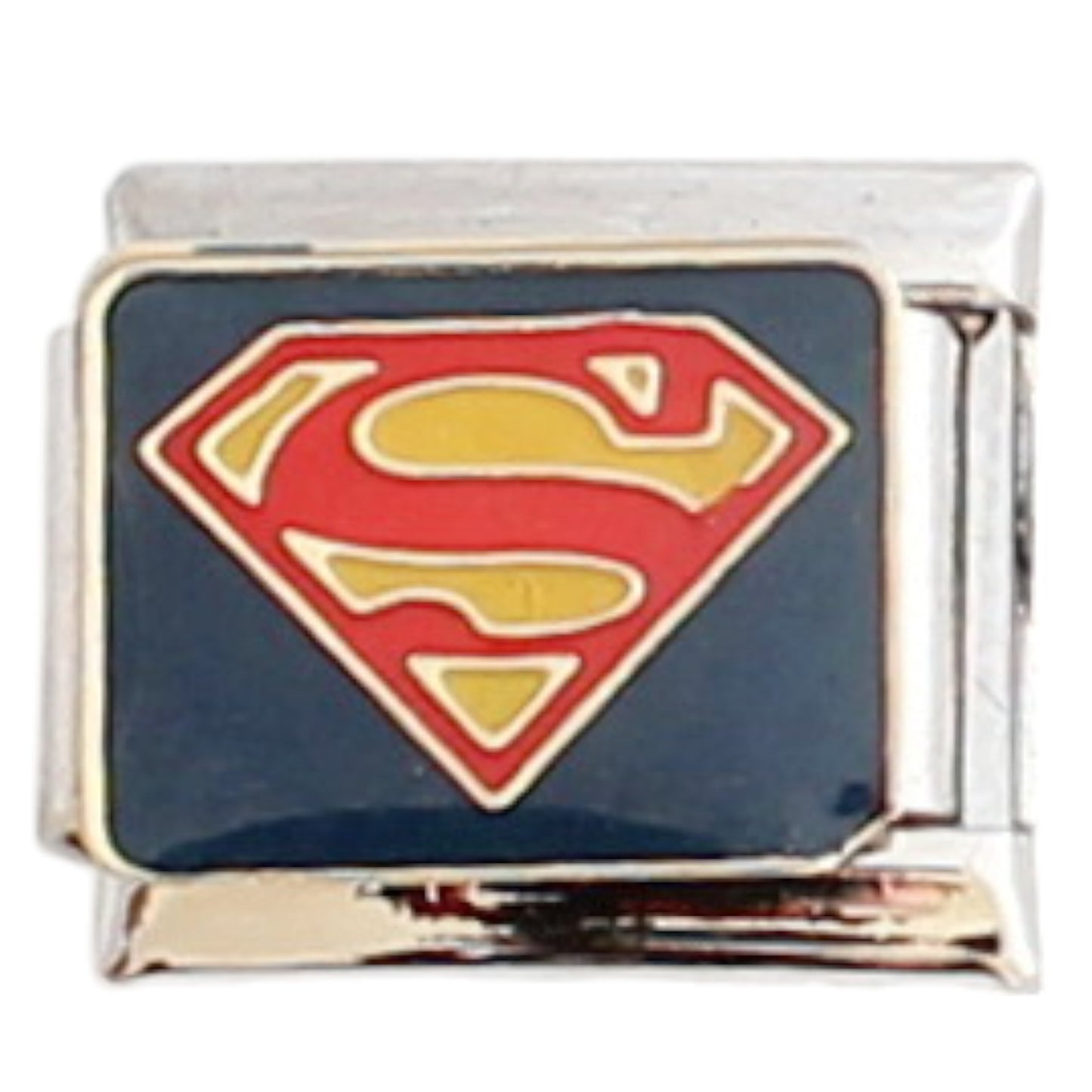 Superman enamel &or metal charm is soldered onto a stainless steel Italian charm. This charm fits any 9mm Italian charm bracelet