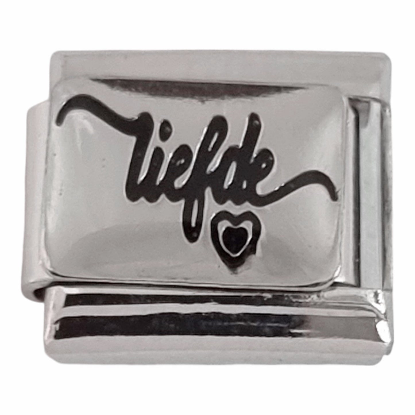Liefde Silver 9mm Charm. Enamel & or metal charm is soldered onto a stainless steel Italian charm. This charm fits any 9mm Italian charm bracelet
