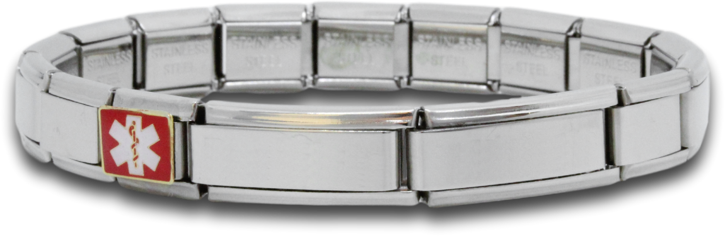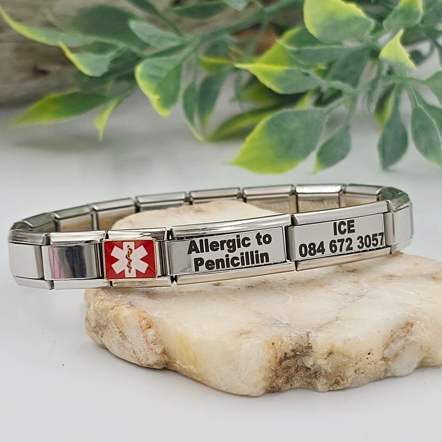 Matte or shiny 9mm stainless steel Italian charm bracelet with 1 medic alert enamel charm and 2 personalized engraved superlink charms. The remaining charms to make up the bracelet (18 links in total) will be single links. Extra engraved superlinks can be added at an extra cost. 18 Links is approximately 17.5cm and we send 4 extra links to adjust the bracelet bigger if need be.