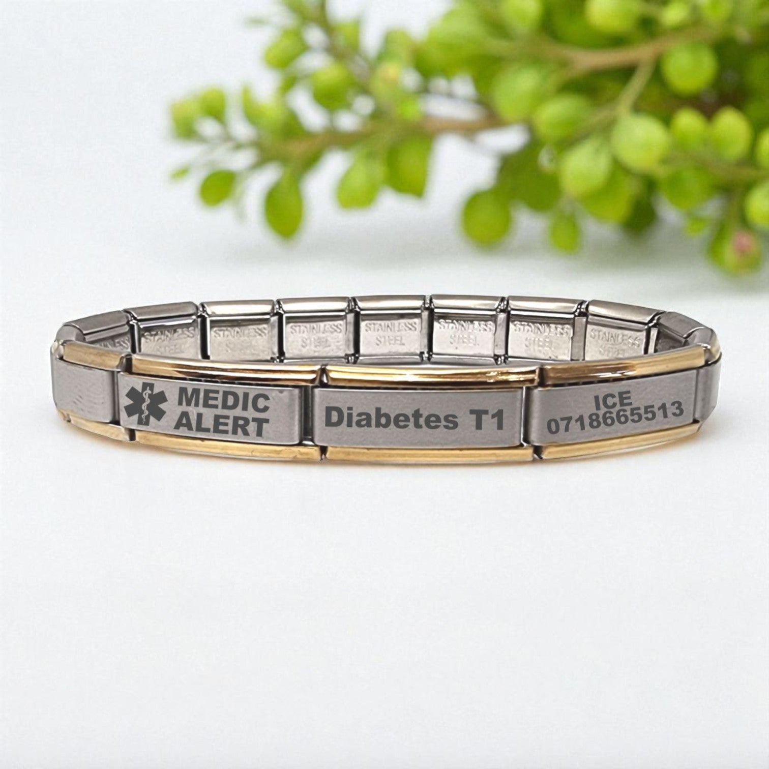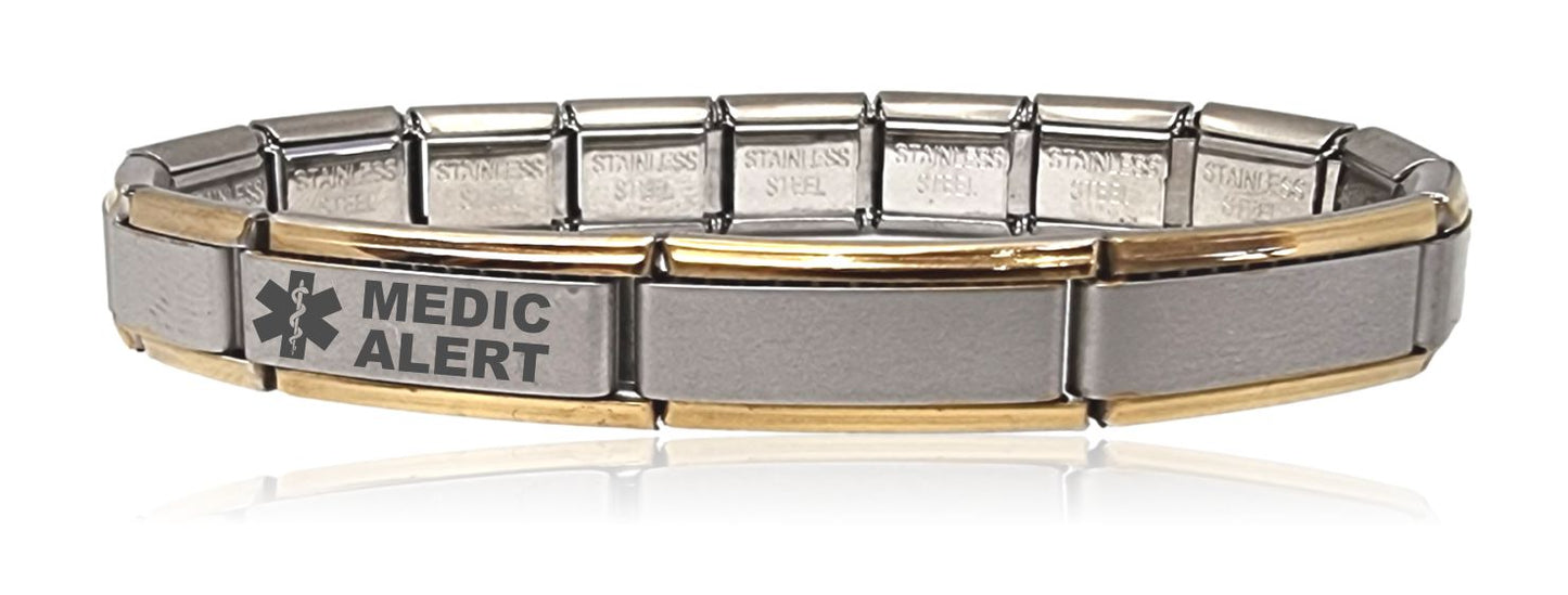 Matte with gold plated edge 9mm stainless steel Italian charm bracelet with 1 engraved medic alert enamel charm and 2 personalized engraved superlink charms. The remaining charms to make up the bracelet (18 links in total) will be single links. Extra engraved superlinks can be added at an extra cost. 18 Links is approximately 17.5cm and we send 4 extra links to adjust the bracelet bigger if need be.
