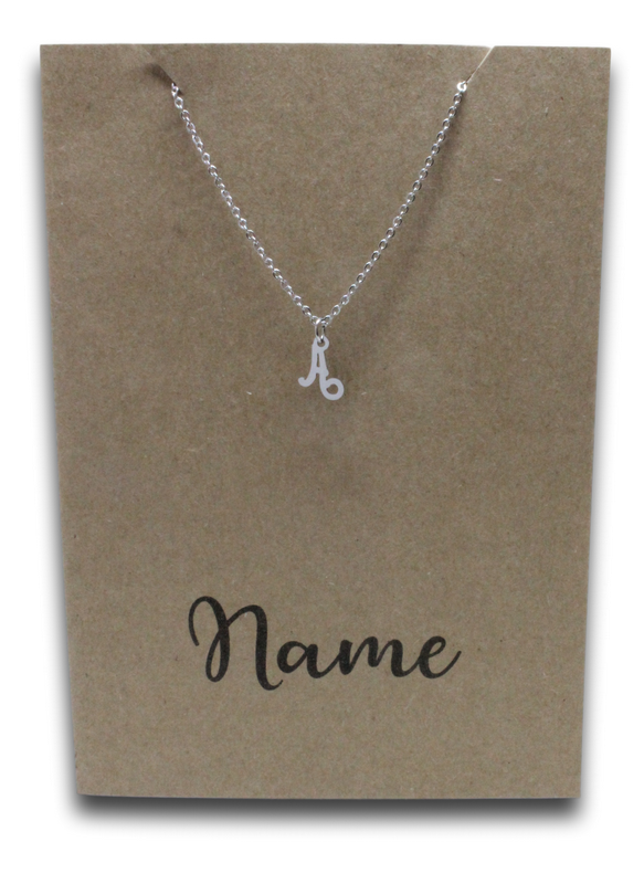 Stainless steel letter A pendant and chain on a personalized gift card