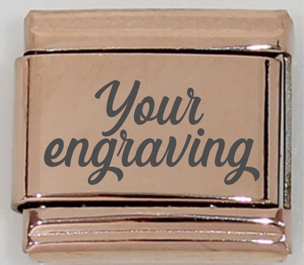 Rose gold 9mm stainless steel Italian charm personalized with a name or word/symbol of your choice.
