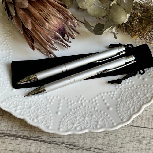 Attractive aluminium pen and mechanical pencil set. The pencil uses 0.5mm lead. Engraved with text and/or a symbol of your choice. Includes velvet pouch if a tin is not ordered*